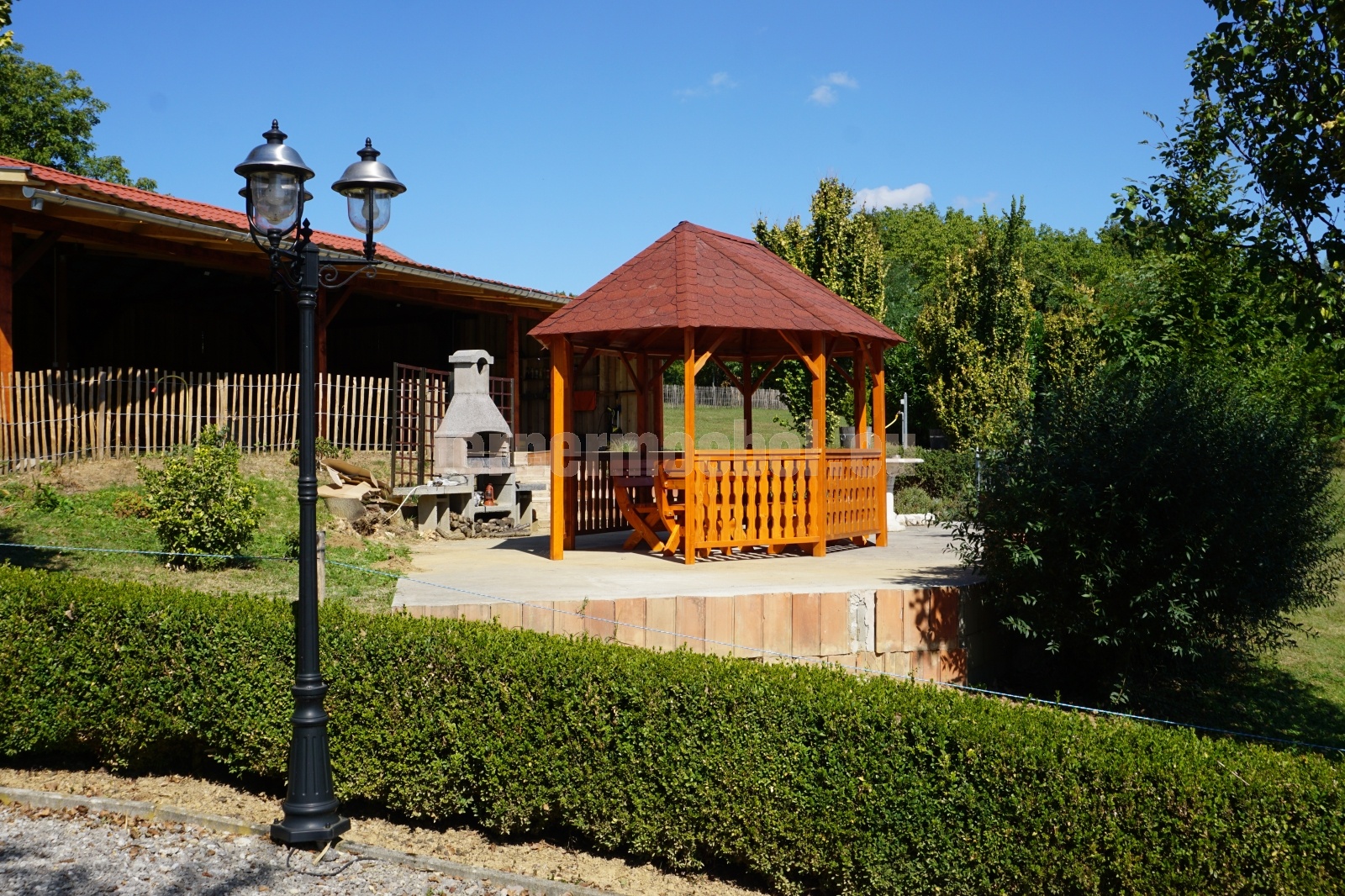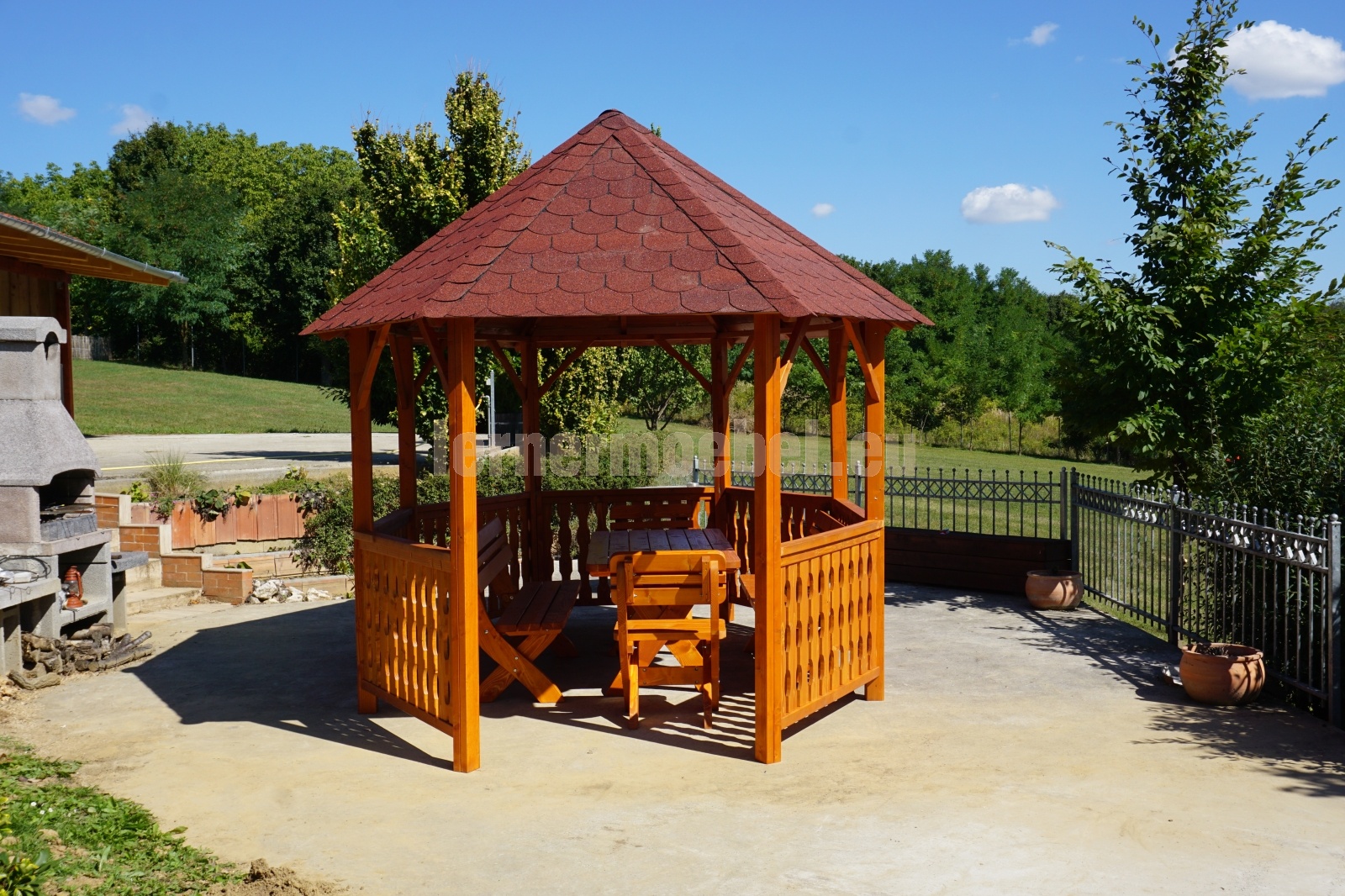 Hamburg - fa kerti pavilon Anyaga: borovi fenyő Felületkezelés: lakklazúr, merítéses eljárással. Tető: borovi fenyő lambéria, bitumenes zsindely.