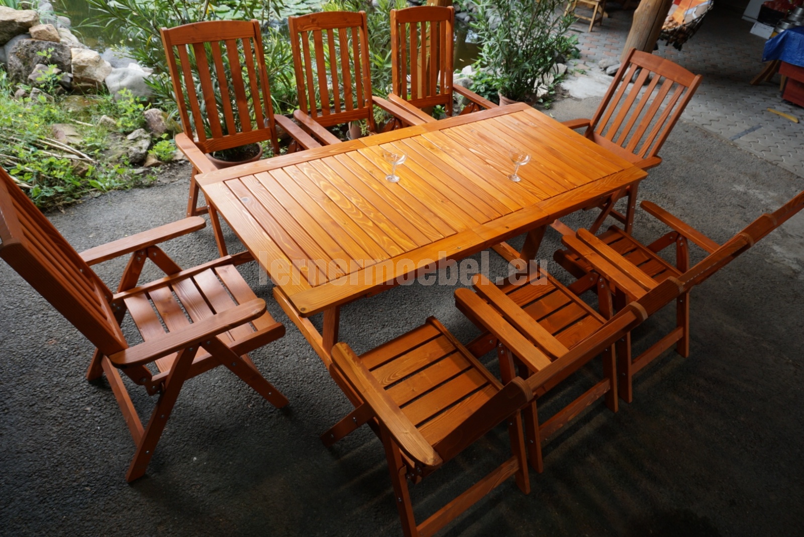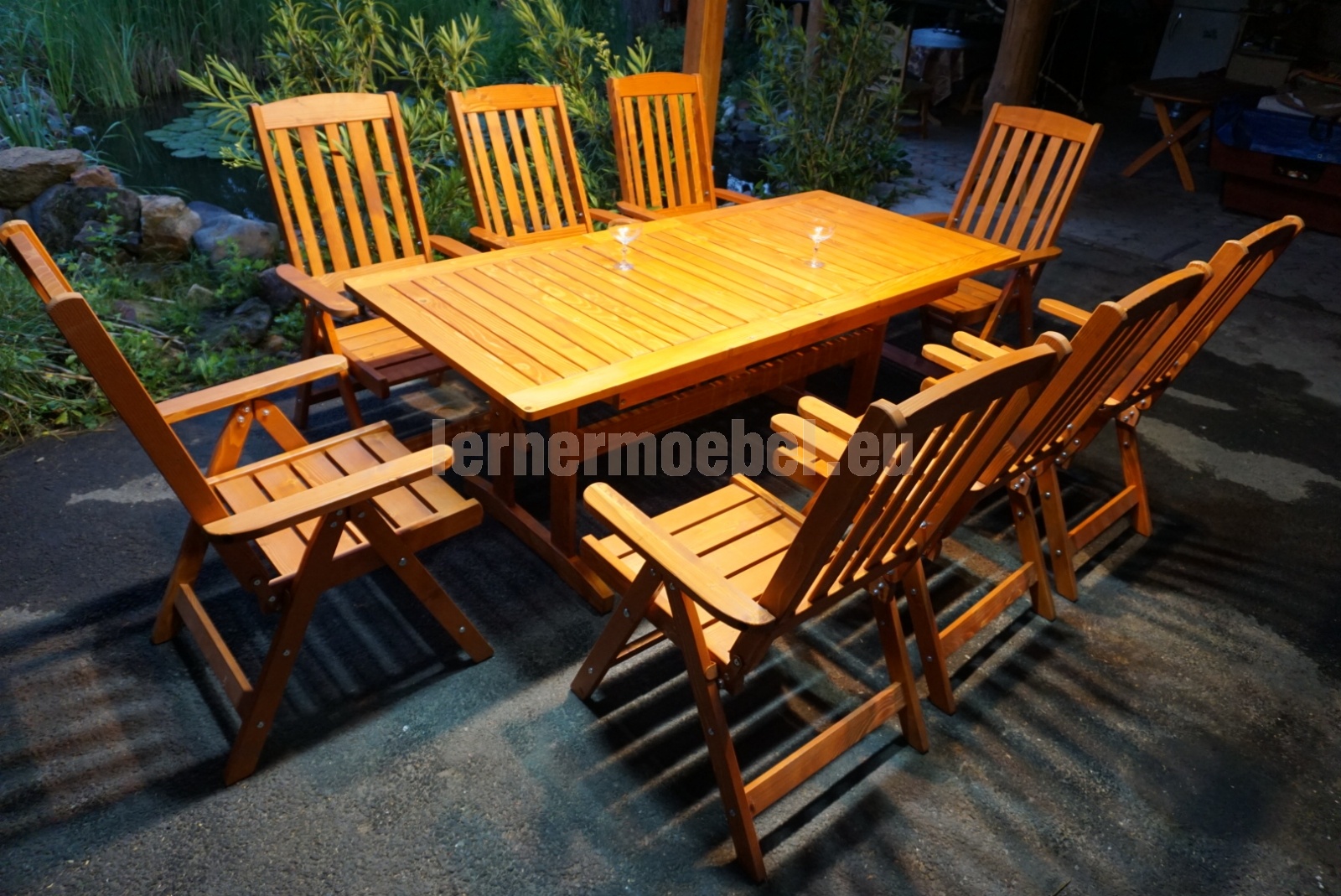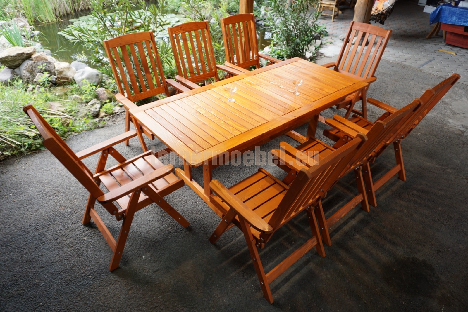 8 személyes kerti garnitúra,állítható, dönthető karosszékkel és bővíthető asztallal.Alapanyaga borovi fenyő.