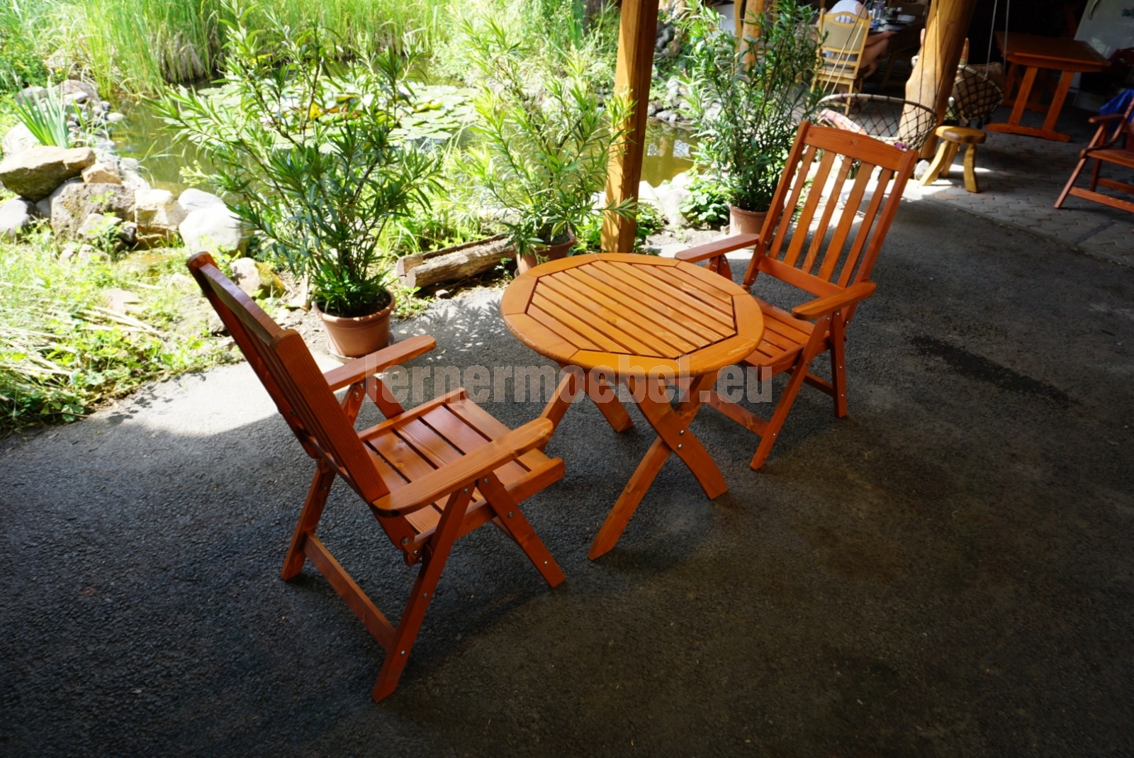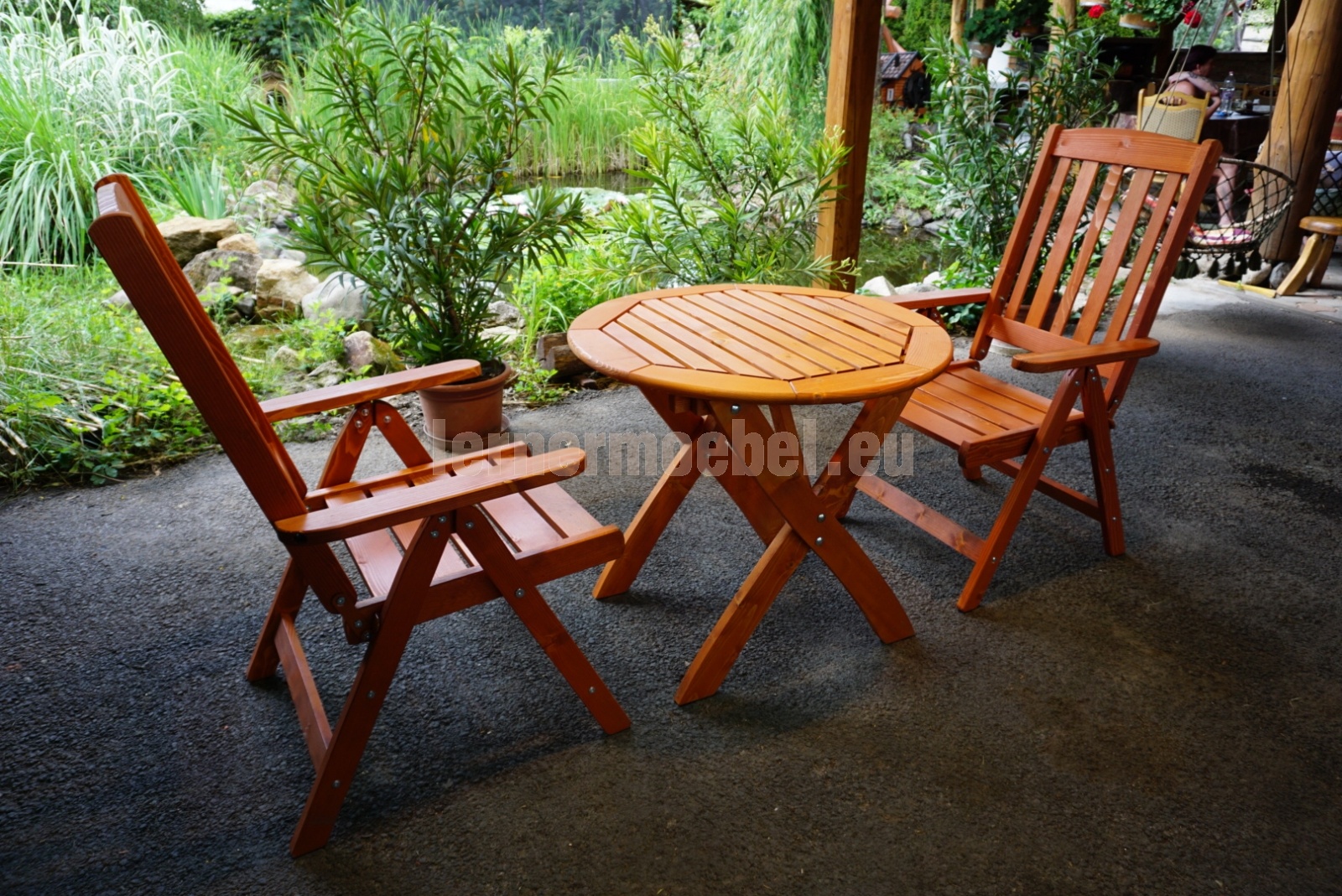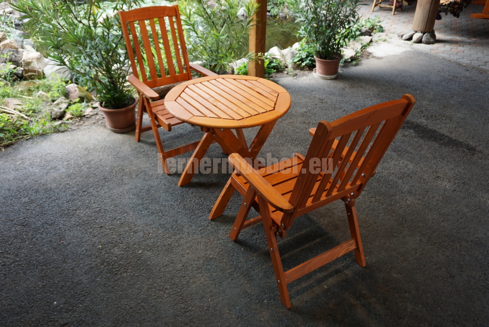 Nürburg két személyes kerti garnitúra. állítható, dönthető karosszékkel.Asztal atmérő 80 cm , magasság 92cm.Alapanyaga borovi fenyő.