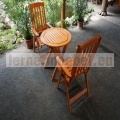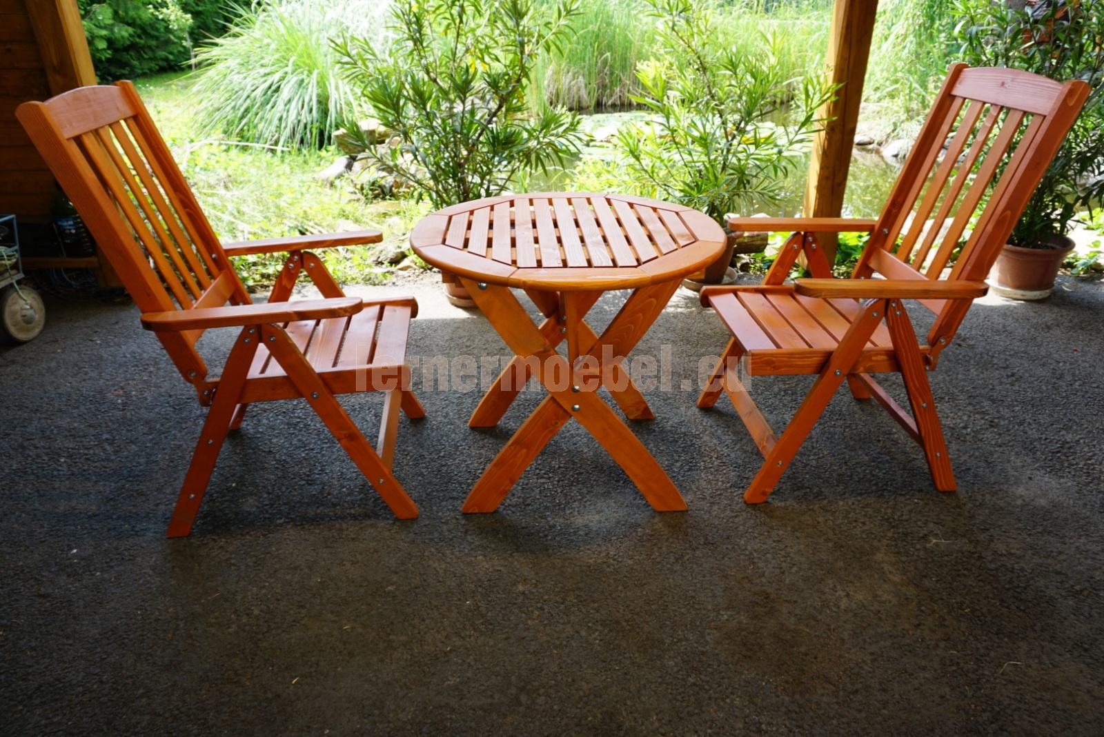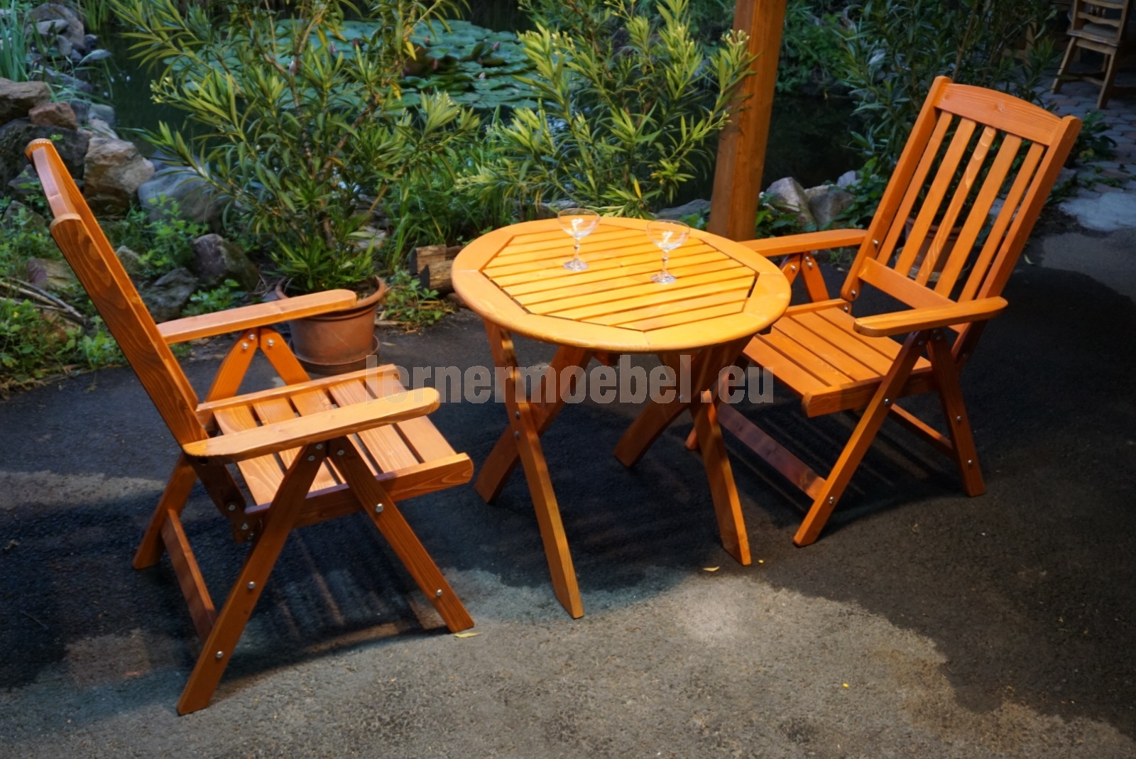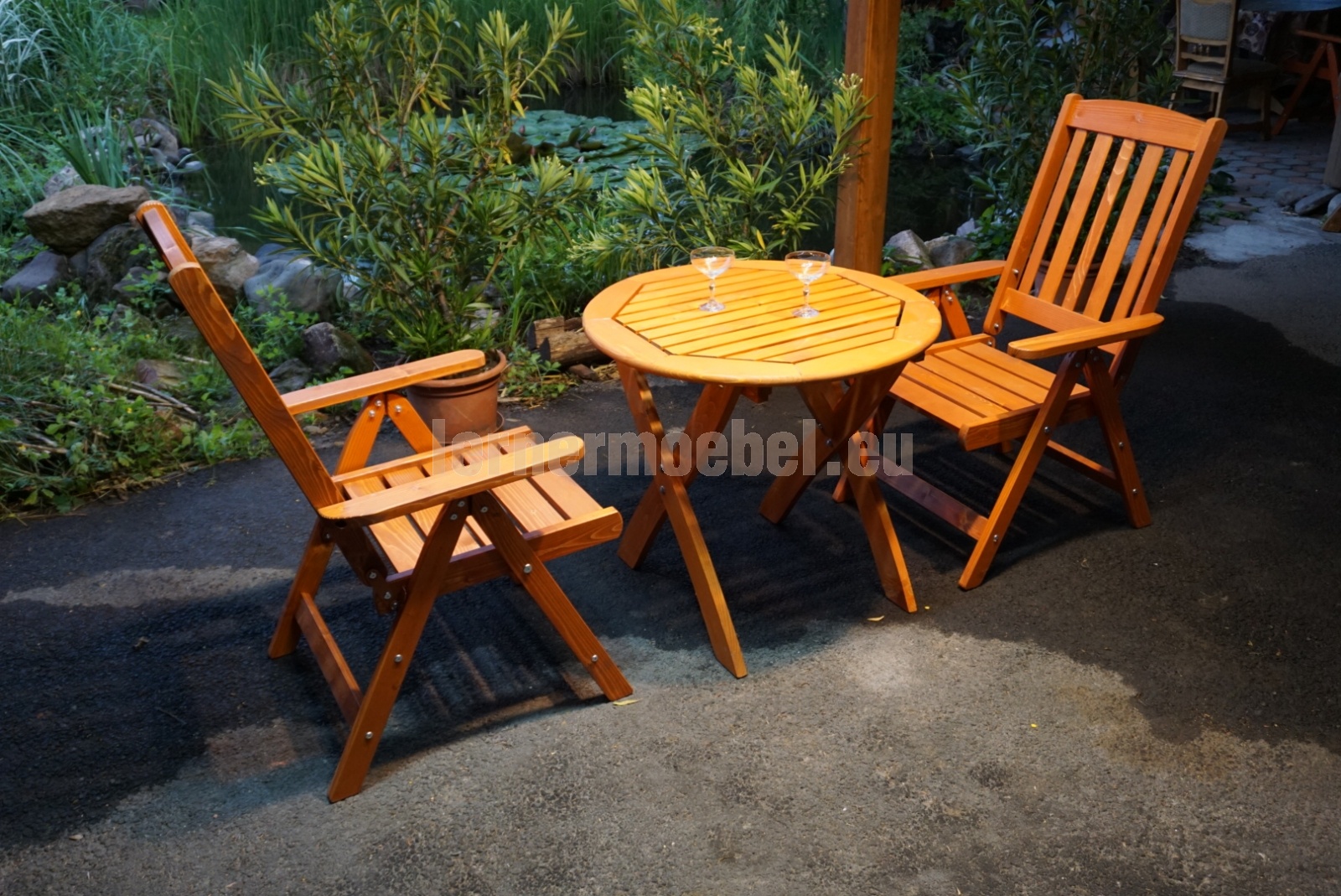Nürburg két személyes kerti garnitúra. állítható, dönthető karosszékkel.Asztal atmérő 80 cm , magasság 92cm.Alapanyaga borovi fenyő.